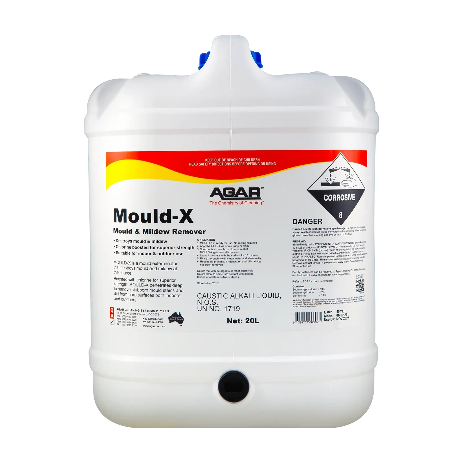 MOULD-X contains available chlorine which is present in the solution in the form of sodium hypochlorite and hypochlorous acid. Hypochlorous acid is a powerful germ-killing agent which kills mould and mildew. MOULD-X also contains caustic alkali and detergents to provide an excellent cleaning action.